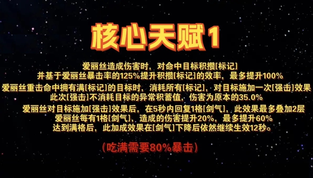 - 蓄力速度:至少兩條,以達到 100% 蓄力速度。蓄力速度越快,愛麗絲開鏡后就能更快地打出滿蓄力傷害。