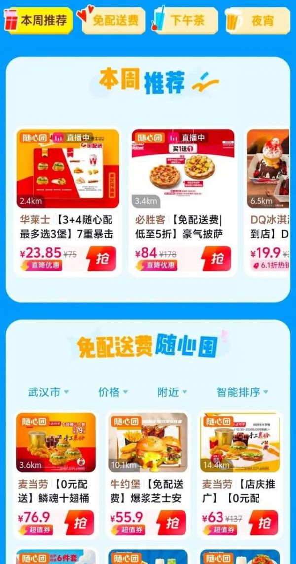 點(diǎn)擊“搶購(gòu)”,會(huì)進(jìn)入到“隨心團(tuán)”頁(yè)面。頁(yè)面內(nèi)除了顯示本周推薦的活動(dòng)商品,還有下午茶、夜宵等分類下的商品,部分商品支持免費(fèi)配送。