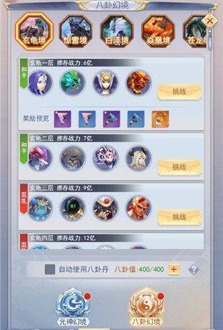 1、玩家可以前往八卦幻境獲取八卦,八卦幻境分為5個境界,每個境界需要對應(yīng)的八卦開啟后才能同步開,而每個境界共分5層,1、2兩層為和平層,3至5層為混亂層,會受到其他玩家攻擊。