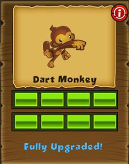 (每發(fā)飛鏢可以攻擊2個(gè)氣球)→(每發(fā)飛鏢可以攻擊3個(gè)氣球)→(每次可以發(fā)射三枚飛鏢)→(增加“變身”技能,把攻擊范圍內(nèi)的飛鏢猴變成超猴)