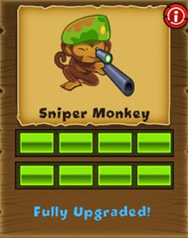 狙擊手猴,全屏幕射程,射速慢,初始每槍穿透兩層氣球,建議點(diǎn)擊后選擇“strong”攻擊模式。