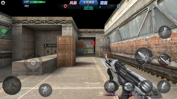 游戲畫(huà)面左下角有一個(gè)圓圈狀的虛擬按鈕,右下角有個(gè)未顯示的虛擬按鈕,玩家通過(guò)滑動(dòng)虛擬按鈕控制人物的動(dòng)作。其中左下角的虛擬按鈕控制移動(dòng)右下角的虛擬按 鈕控制準(zhǔn)星和射擊。同時(shí),在畫(huà)面左上角設(shè)置按鈕中有戰(zhàn)績(jī)查詢、游戲設(shè)置、鍵位設(shè)置功能,左下角有蹲下按鈕,畫(huà)面右側(cè)分布有跳躍、切換武器、換子彈、扔手雷 等按鈕。