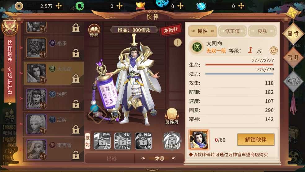 被動(dòng)技能:大司命100%免疫石化與混亂,并且增加等級(jí)*0.8的法攻屬性