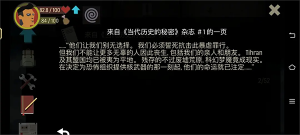 天空之山是一款很受歡迎的角色扮演生存類的手機(jī)游戲。是從端游上移植而來的,即便是在手機(jī)上也可以體驗到游戲帶給你的魅力的。在游戲內(nèi)玩家將會扮演一位末日世界的幸存者的,需要你在這個充滿著變異喪尸的世界中生存的。游戲的背景是設(shè)定在了第三次大戰(zhàn),男主角僥幸活下來了,需要玩家不斷收集物資,然會活下來的。游戲還是有著超高的隨機(jī)性的,是可以為游戲增加更多的樂趣的。想?yún)⑴c就趕緊點擊它下載吧。