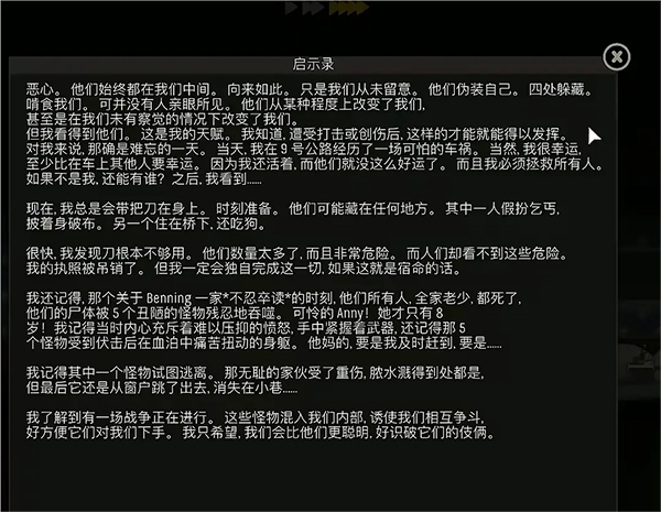 結(jié)局一:世界觀,首次進(jìn)入游戲會播放一段動畫,大意是歐美和東方(個人感覺就是亞洲)進(jìn)行戰(zhàn)爭,但是東方投下了生化武器,大家都變異了,而外出的主角為了活著出去見到女兒必須從一百樓殺出去。