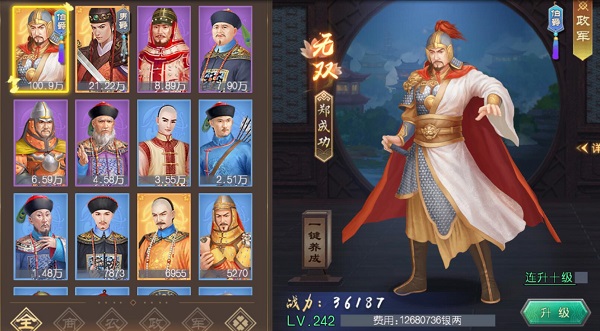 軍事升級(jí)主要是對(duì)關(guān)卡的貢獻(xiàn)。在此建議前期要偏向于商業(yè)大臣和軍事大臣,因?yàn)樯虡I(yè)提高后,征收會(huì)獲得更對(duì)的銀兩,而軍事提高后,有利于關(guān)卡戰(zhàn)斗力會(huì)相應(yīng)提高。在游戲前期盡快進(jìn)行關(guān)卡戰(zhàn)斗獲取君王經(jīng)驗(yàn),君王等級(jí)每提升一級(jí)會(huì)開啟一次科舉選取,圣上們可以選擇自己喜愛的大臣冊(cè)封狀元,大臣升級(jí)是提升國(guó)力的最快最基本的方式。