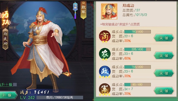 每個(gè)大臣的屬性是不一樣的,有些玩家會(huì)選擇先升級(jí)商業(yè)屬性的,有些玩家會(huì)選擇先升級(jí)軍事屬性的,這個(gè)和每個(gè)人的玩法有區(qū)別。