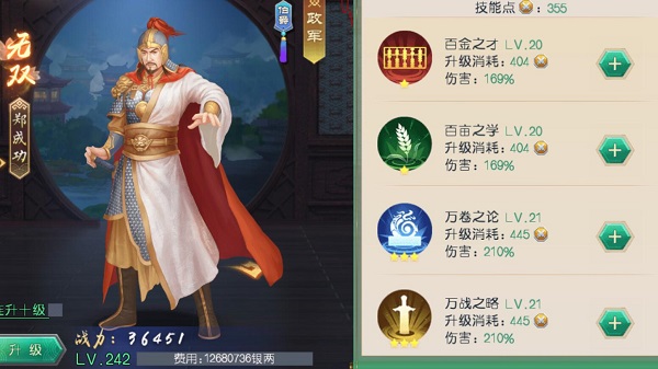 技能點(diǎn)也可以在校場(chǎng)中獲取或者使用技能點(diǎn)包,使用后獲得的技能點(diǎn)可以升級(jí)技能等級(jí)。平衡屬性的大臣可以根據(jù)圣上們的自己的喜好選擇升級(jí)建議優(yōu)先升級(jí)名臣星級(jí)較高的屬性,因?yàn)樾羌?jí)高的緣故初始的技能傷害也就高于其它3項(xiàng)。