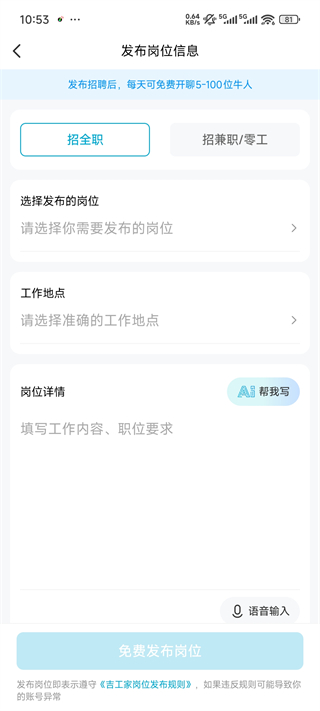 5、選擇發(fā)布的崗位、地點、內(nèi)容點擊發(fā)布即可