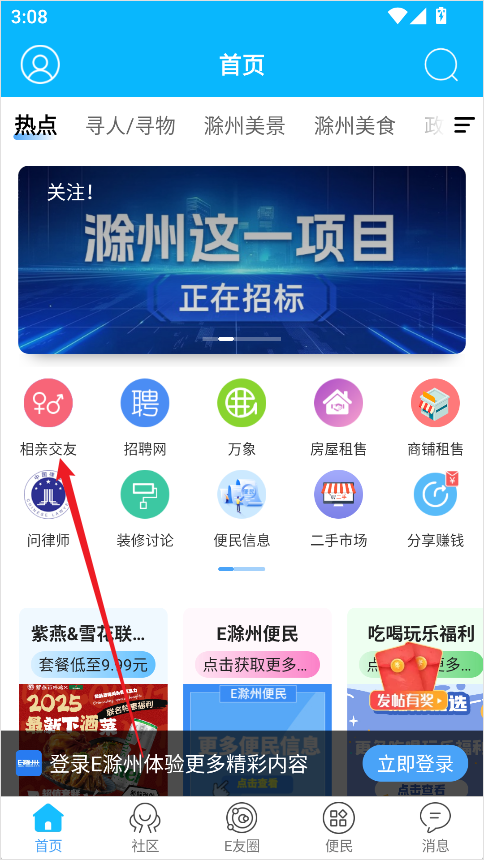 1、打開(kāi)E滁州App后點(diǎn)擊首頁(yè)的「 相親 交友」模塊;